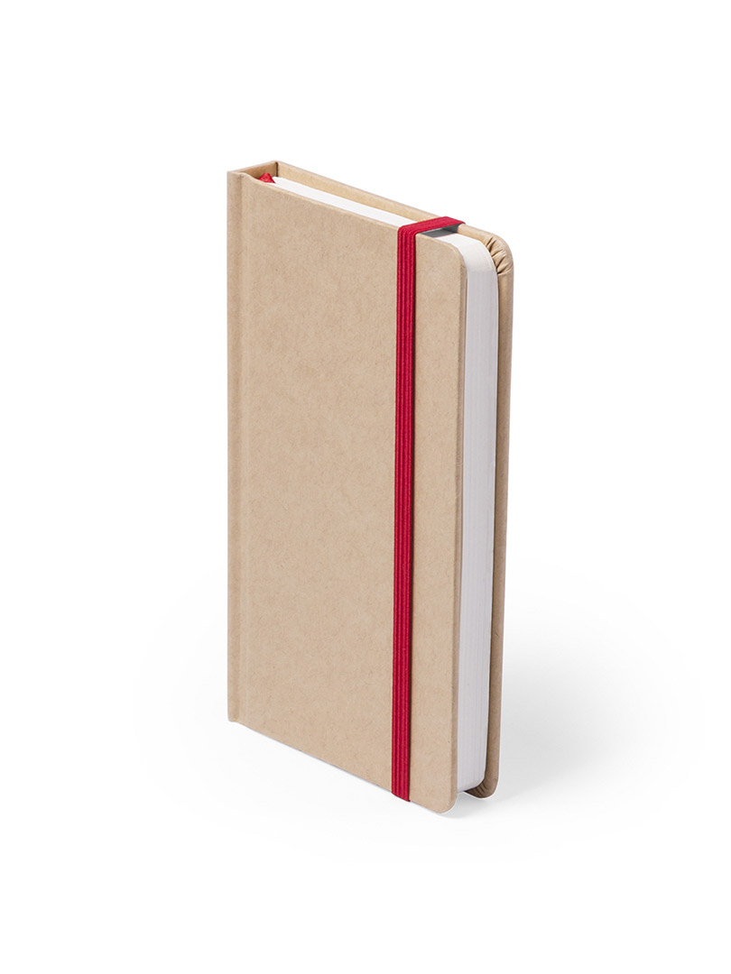 Libreta con tapas cartón natural. De 100 hojas lisas, con elástico de sujeción y marcapáginas de tela a juego.