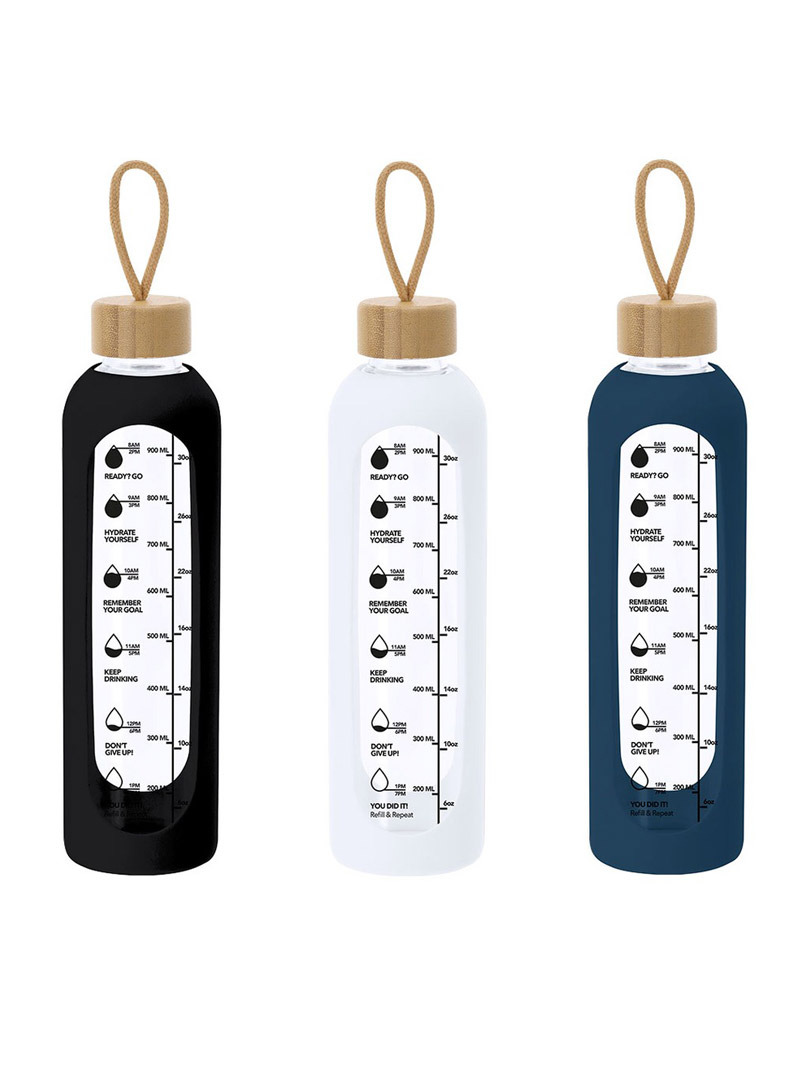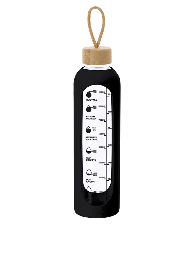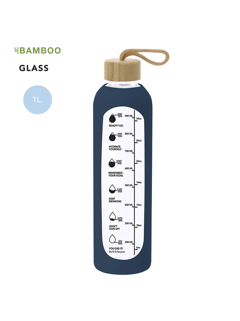 Botella promocional de cristal, 1L de capacidad. Diseñado para fomentar una hidratación adecuada. Recubierto con funda de silicona que protege y proporciona un agarre cómodo y seguro. Tapón, elaborado en bambú, incluye cordón para transporte.