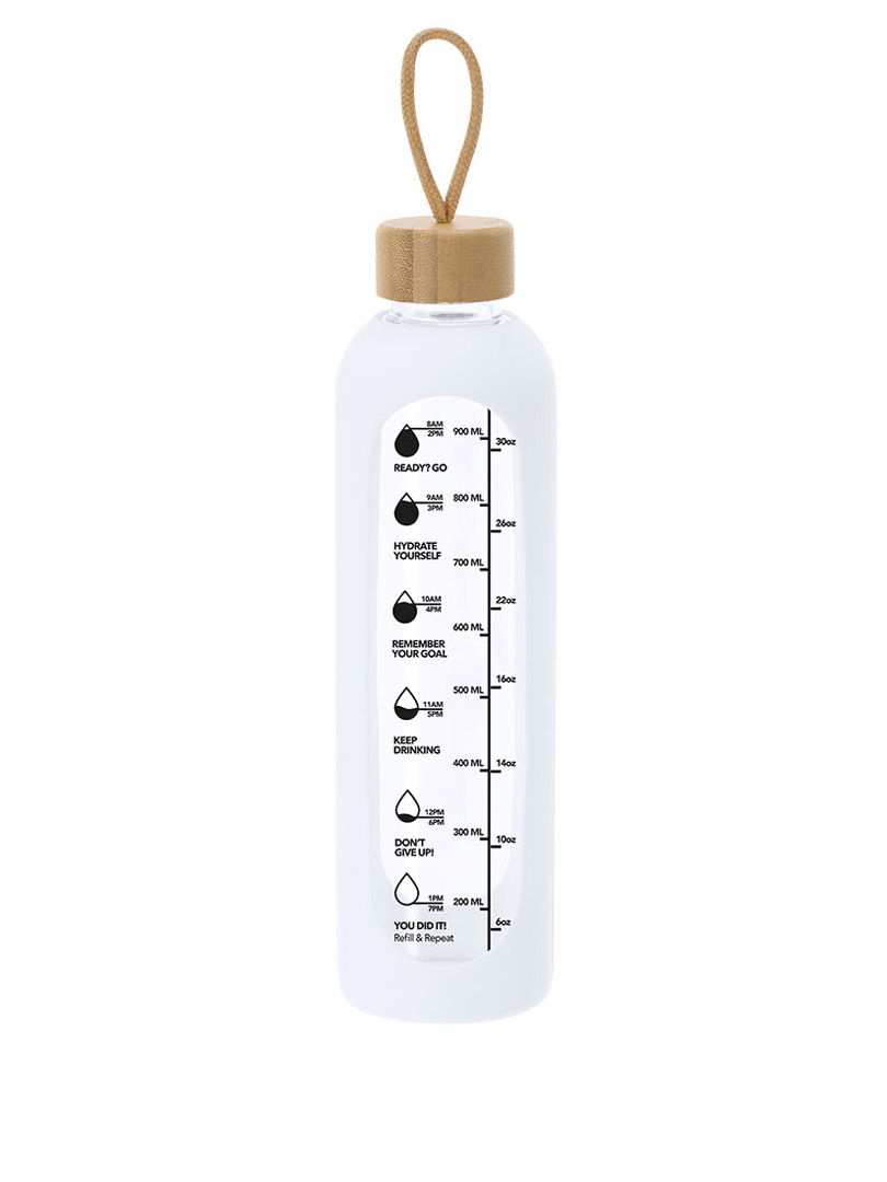 Incluye indicador de capacidad en litros y onzas, acompañado de frases motivadoras que inspiran a mantener una correcta hidratación diaria.