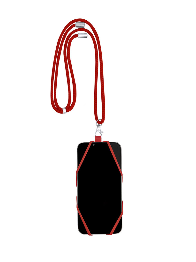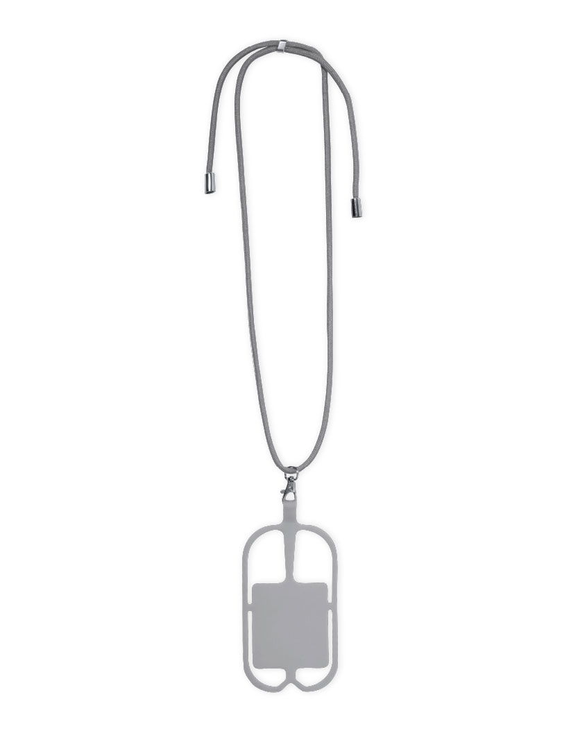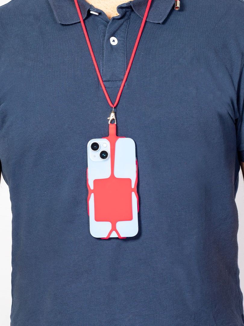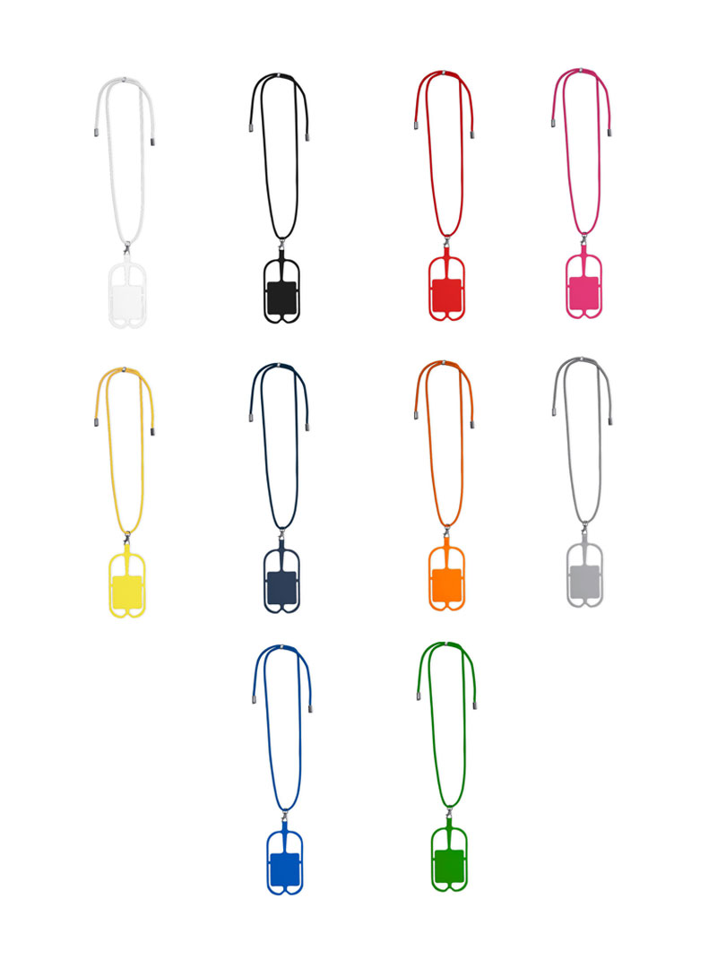 Lanyard personalizado con porta móvil. Con accesorio de transporte para todo tipo de smartphones, capaz de ajustarse a todas las pantallas. Ajustador en cuello y extremos de cordones en acabado cromado. Incluye amplia zona de marcaje.