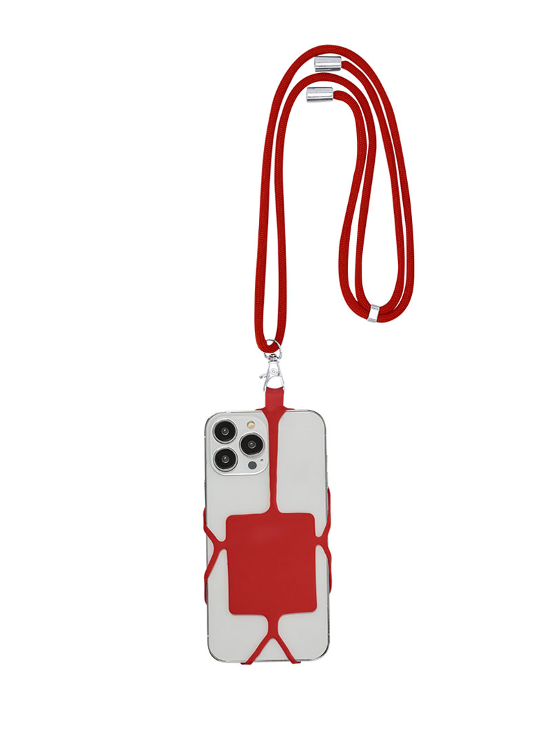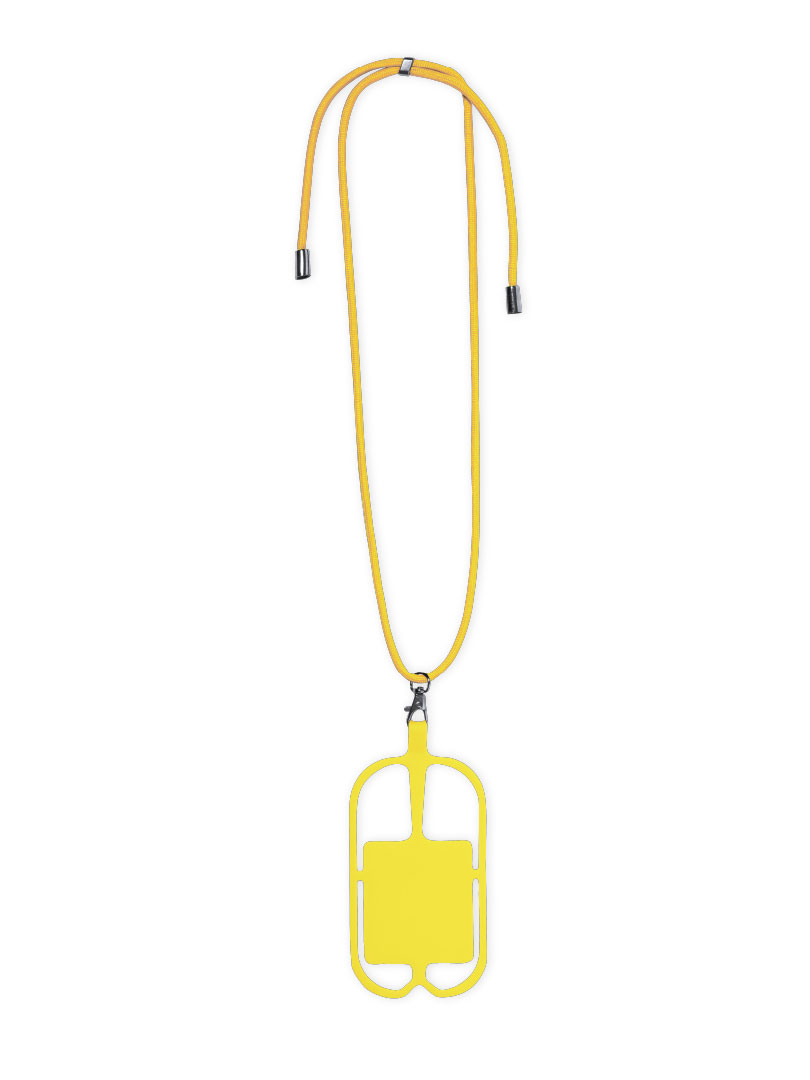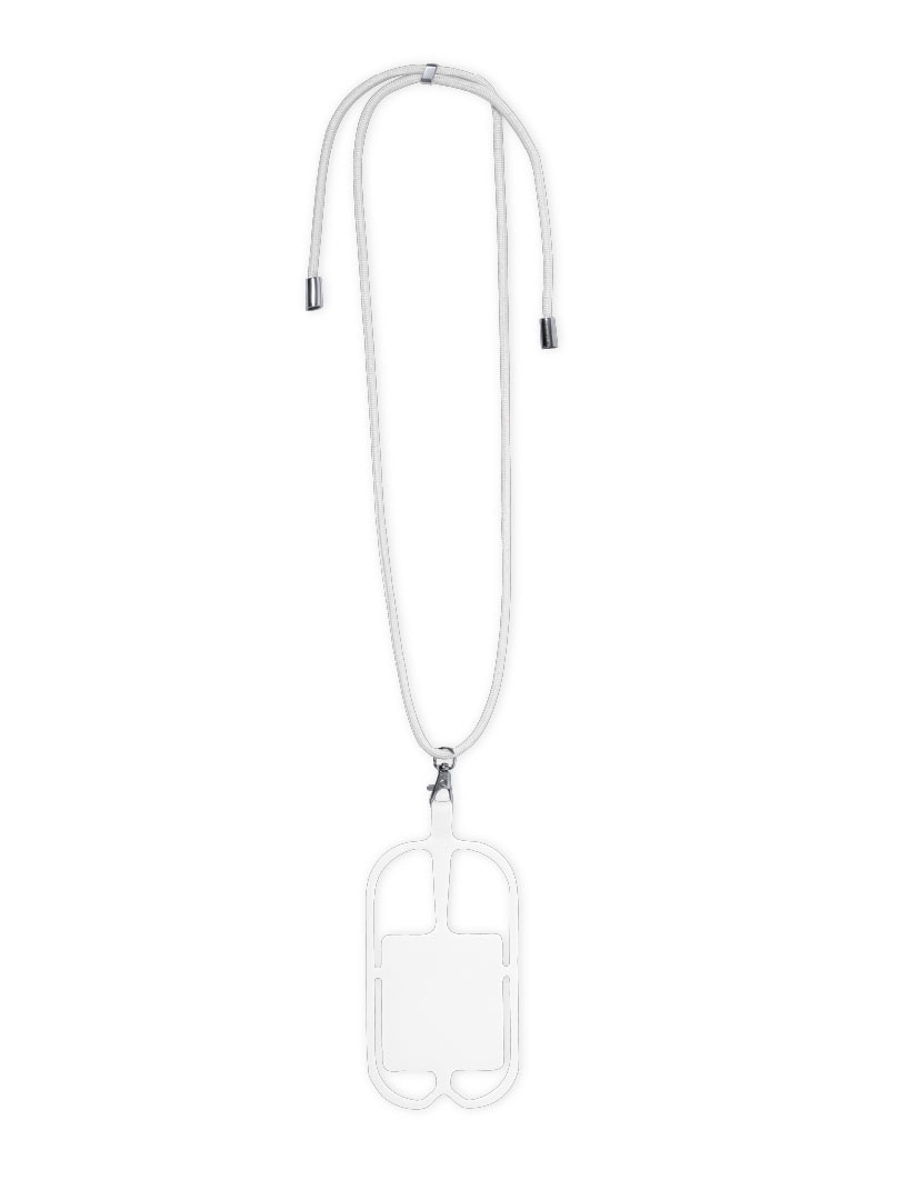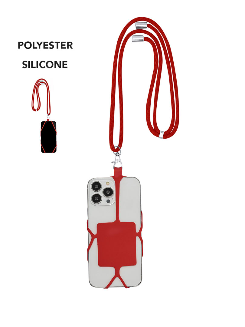 Lanyard personalizado con porta móvil. Con accesorio de transporte para todo tipo de smartphones, capaz de ajustarse a todas las pantallas. Ajustador en cuello y extremos de cordones en acabado cromado. Incluye amplia zona de marcaje.