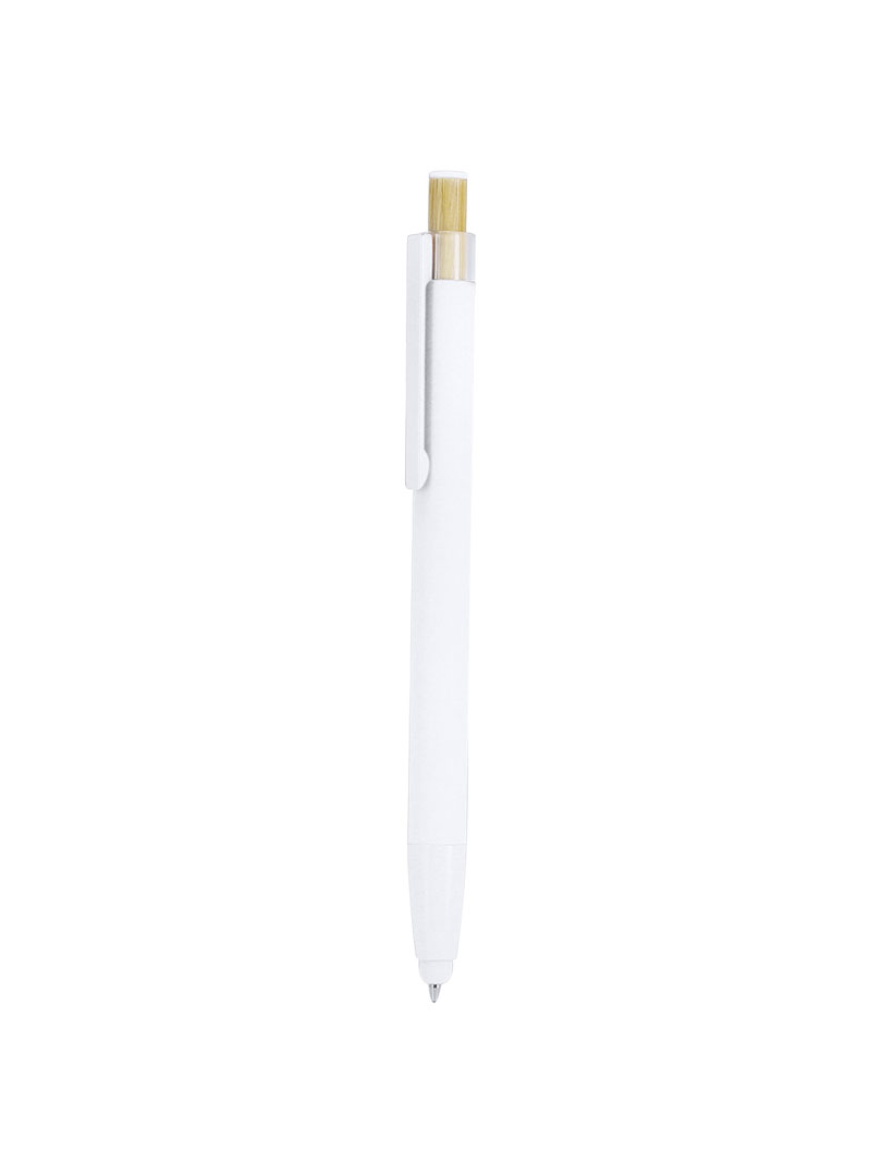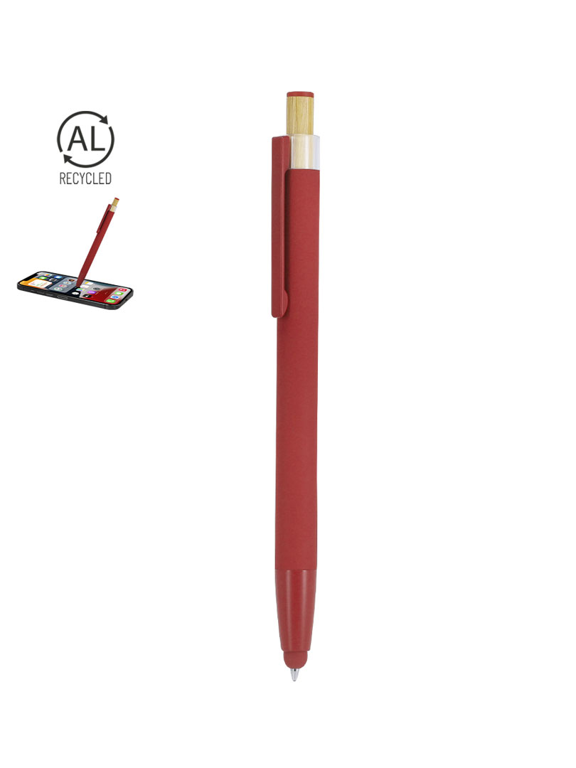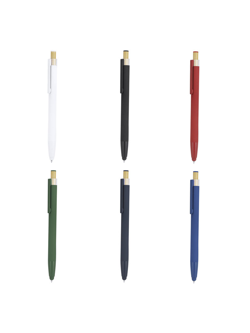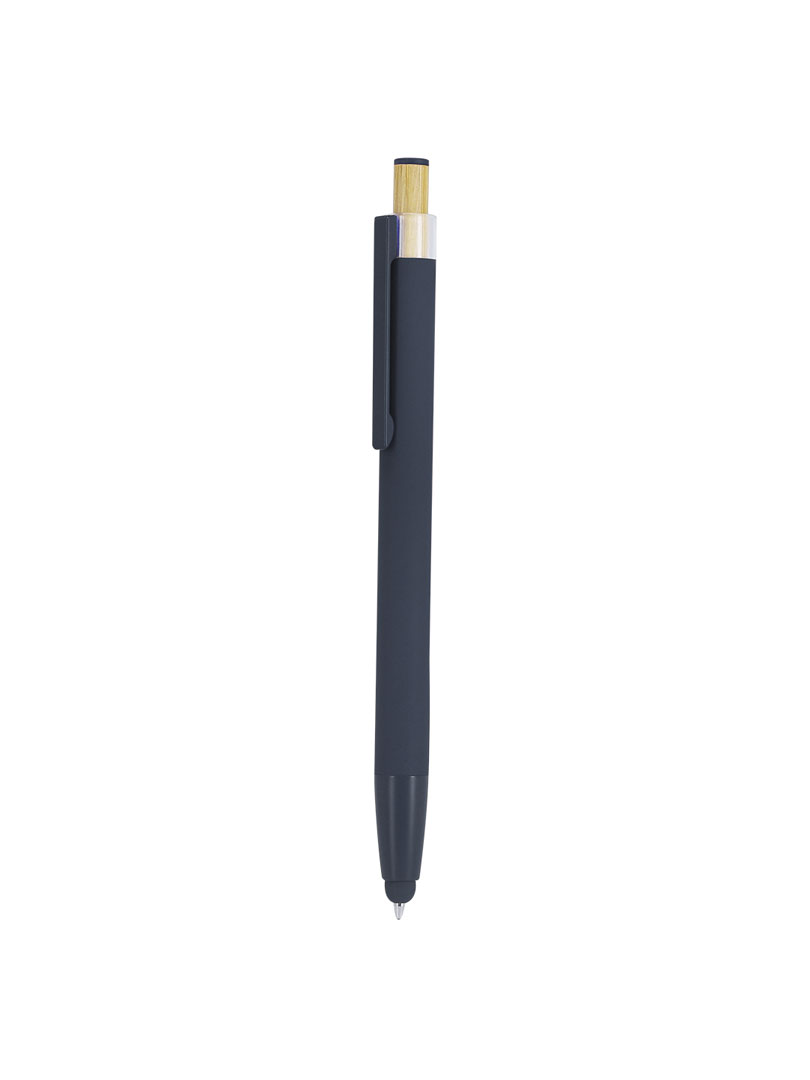 Lapicero promocional con puntero y cuerpo en acabado gomoso. Diseñado con pulsador en bambú y detalle superior a juego con el color del cuerpo y clip metálico a tono. Mecanismo pulsador. Incluye distintivo aluminio reciclado. Certificación GRS (Global Recycled Standard / Estándar de Reciclaje Global).