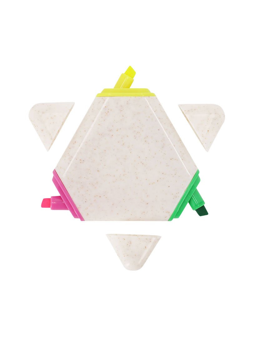 Marcador promocional fluorescente de tres colores fabricado en caña de trigo, con cuerpo de triangular acabado brillante, especialmente diseñado para marcaje a todo color. Con capuchas opacas.
