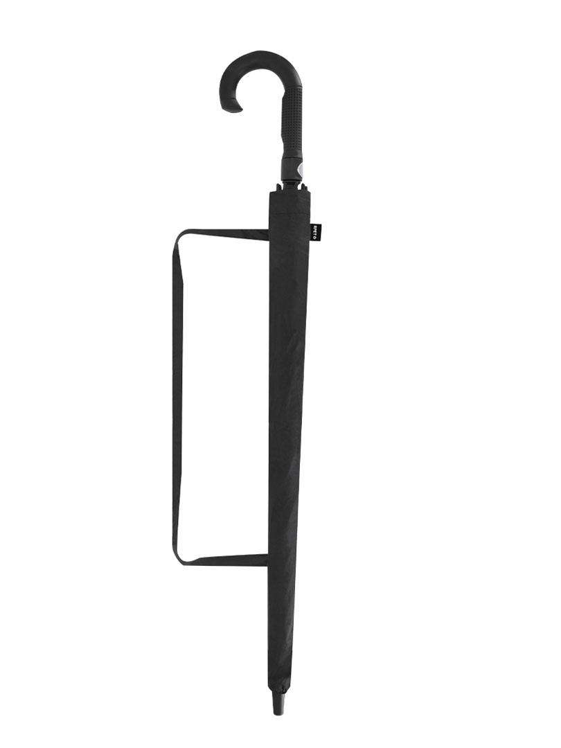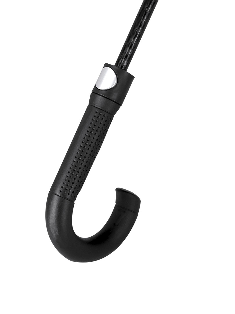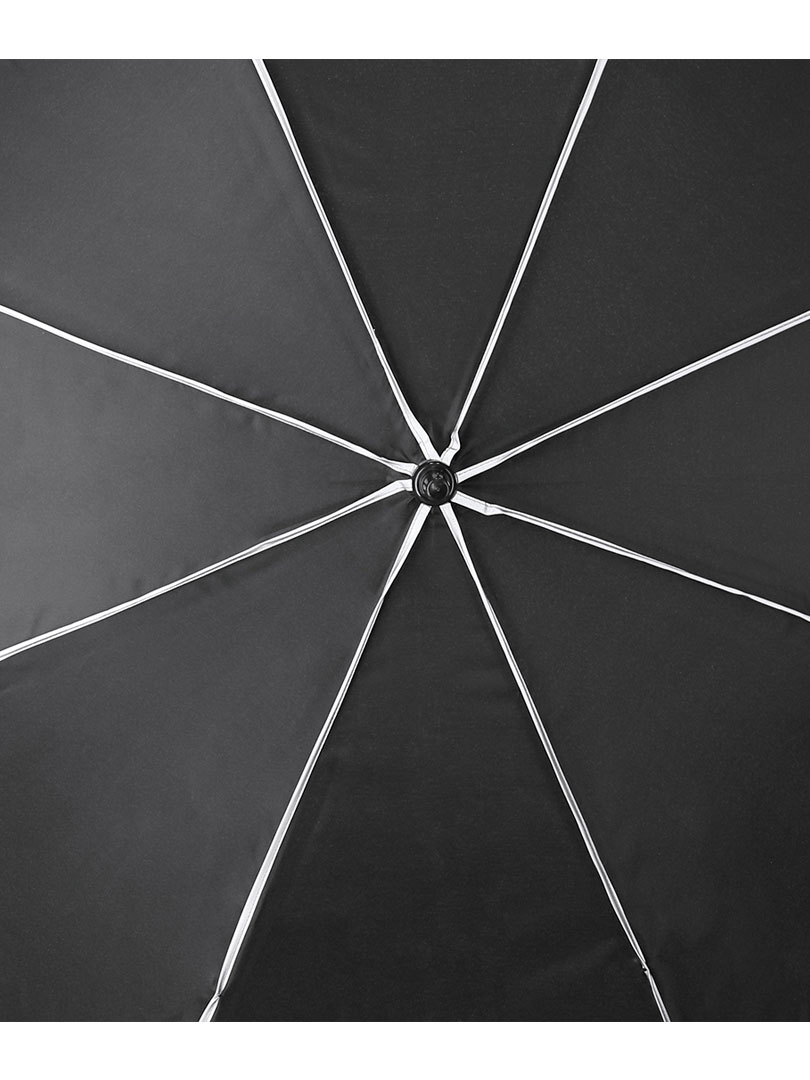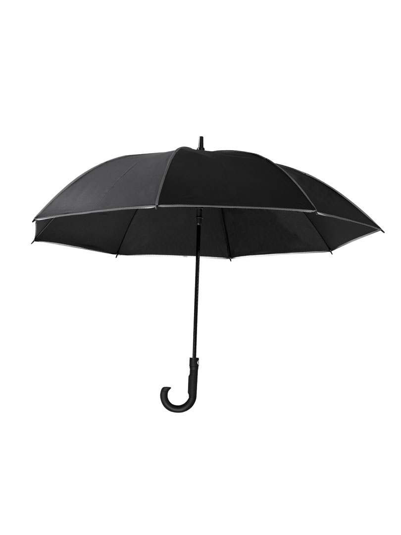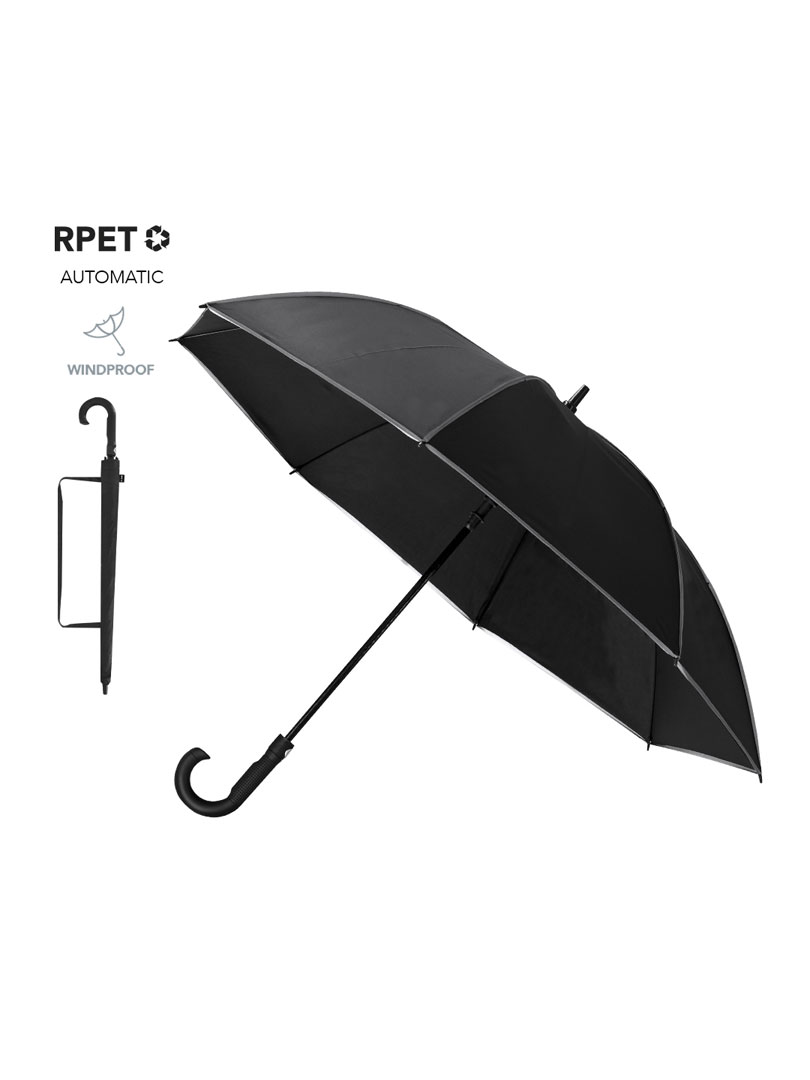 Paraguas personalizado anti viento de 8 paneles, con elegante diseño en color negro con ribetes reflectantes. De 120cm de diámetro, con apertura automática y en resistente material pongee. Con varillas en fibra de vidrio en color negro, cierre de velcro y mango en PP. Incluye funda con correa ajustable para fácil transporte y distintiva etiqueta RPET.